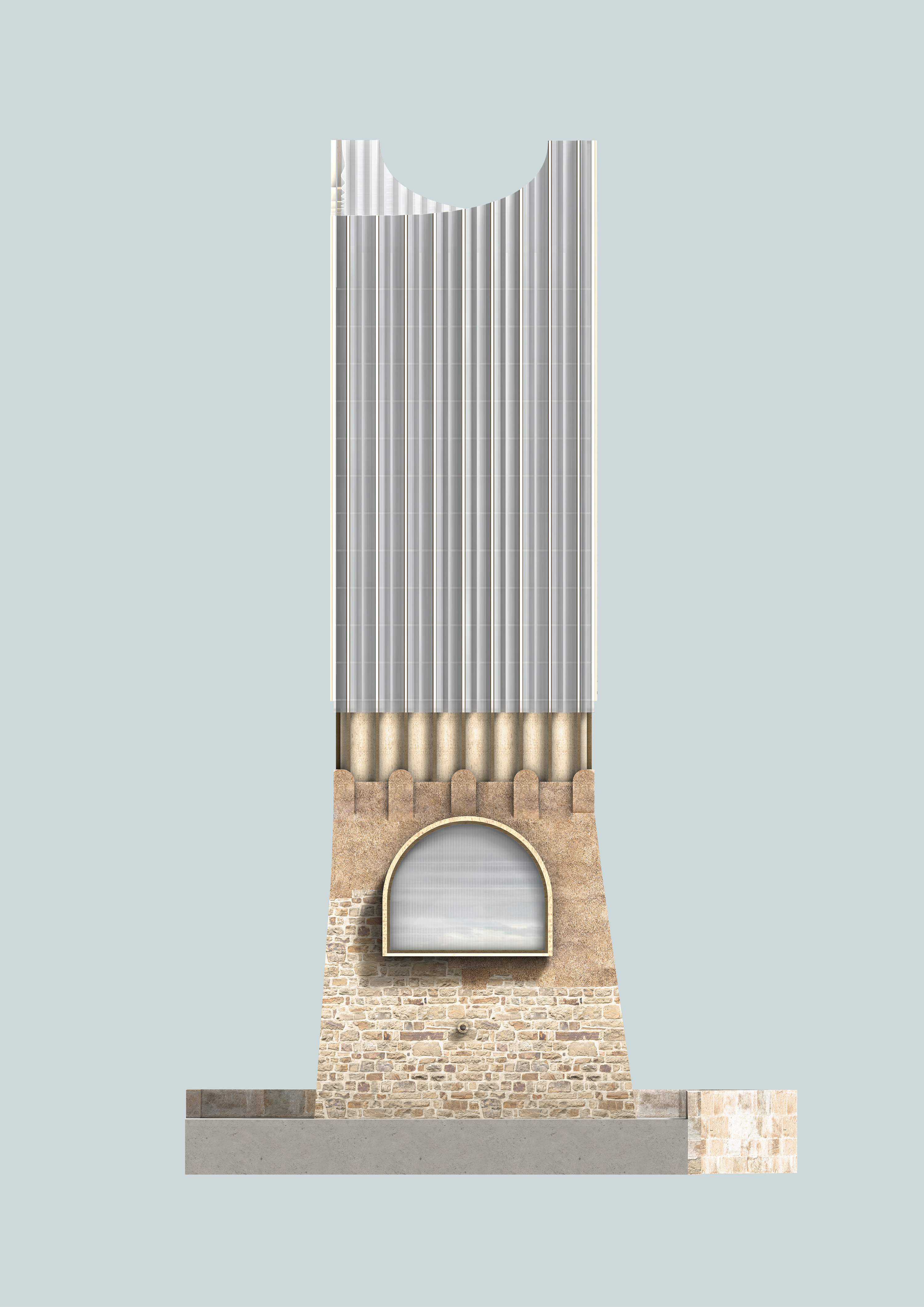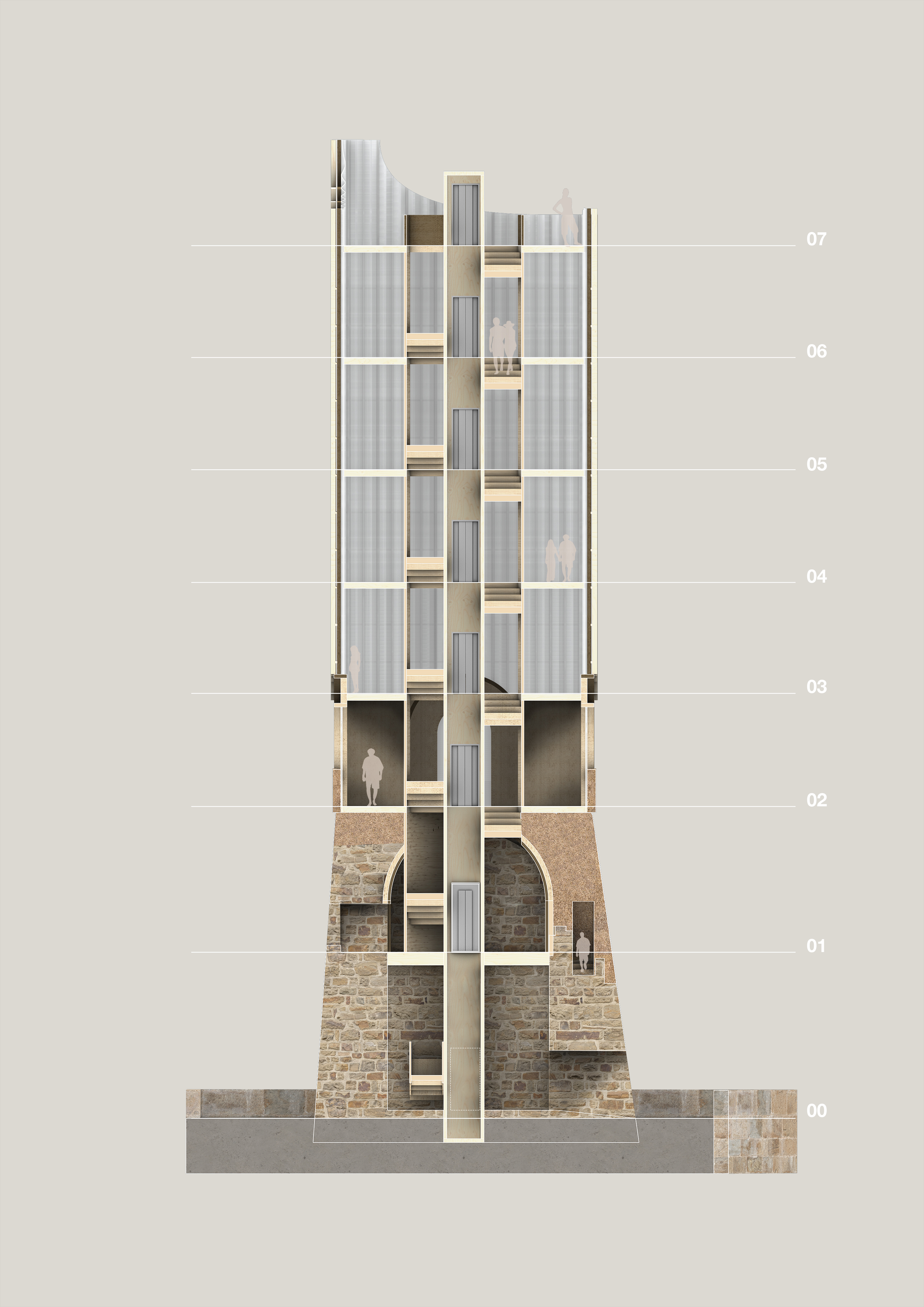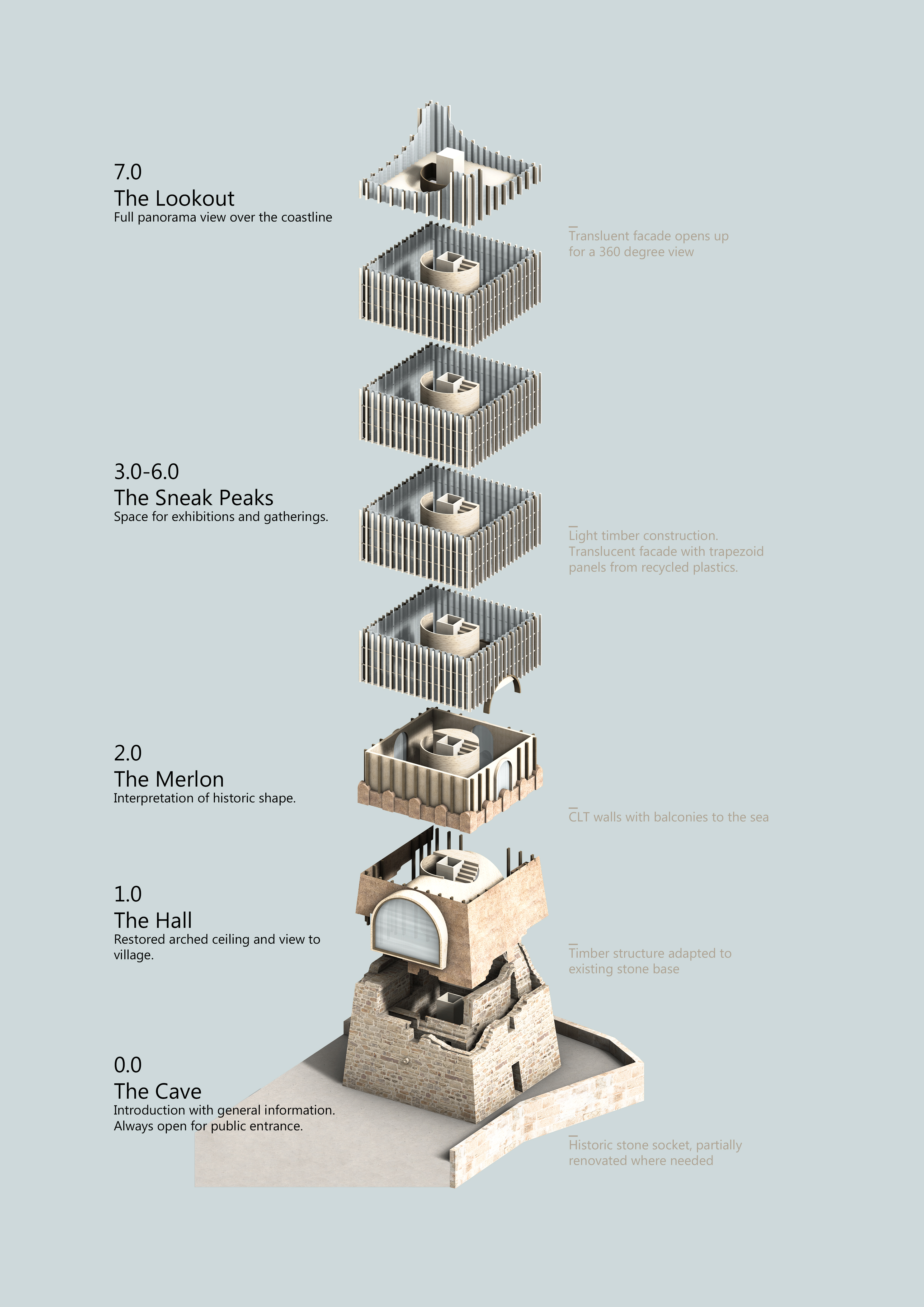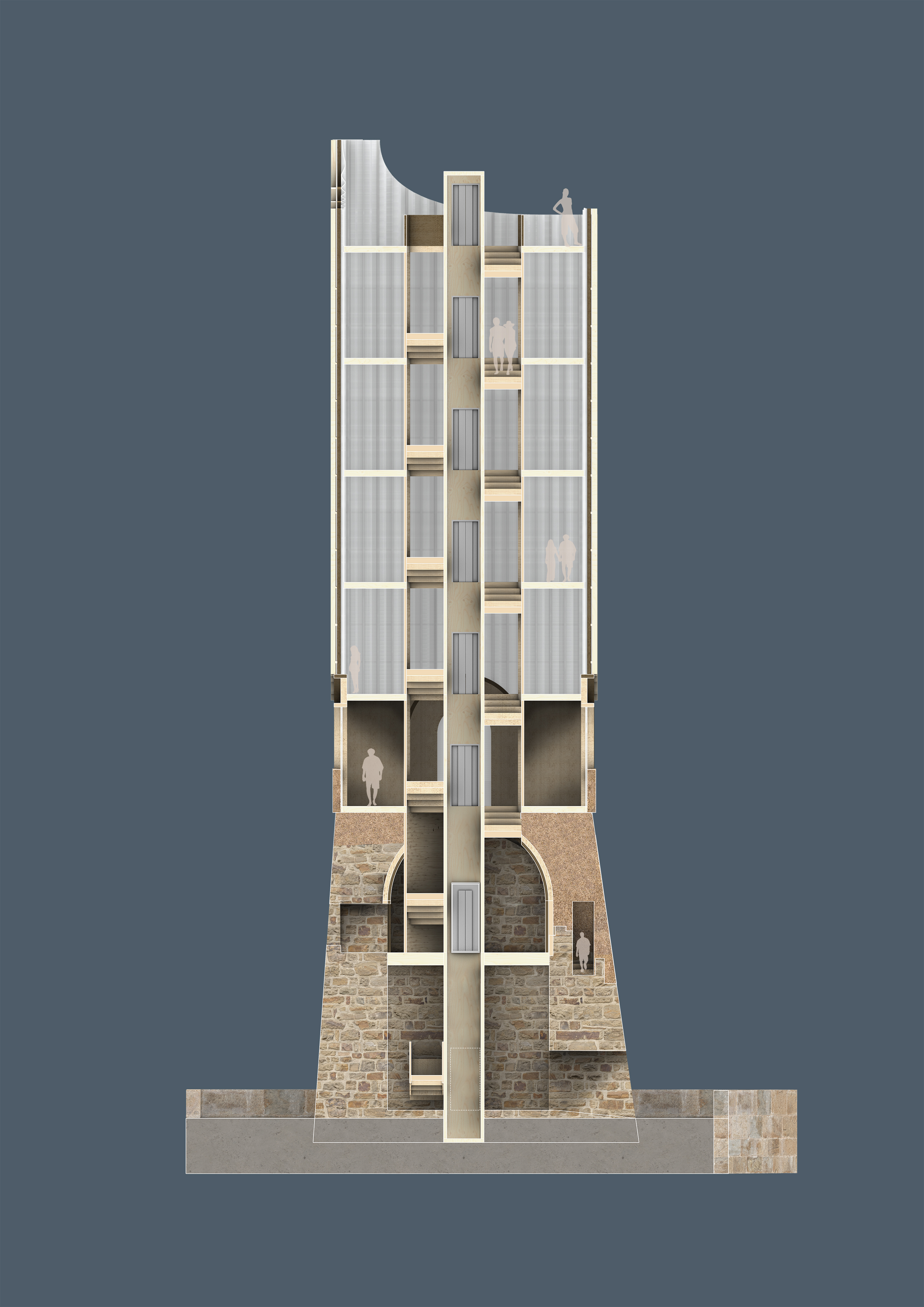 the lasting parts of the tower and adds carefully elements to create a new